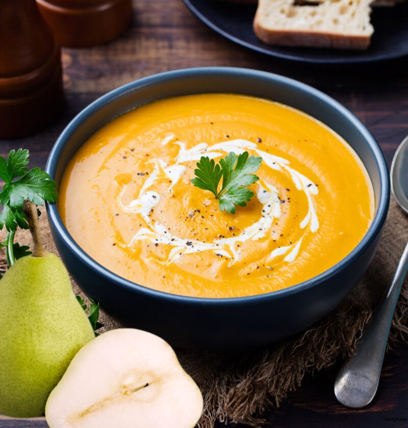 Kremowa zupa dyniowa z pieczoną gruszką i batatem – ta wersja zupy dyniowej jest jeszcze prostsza i smaczniejsza. Pieczenie wydobywa najlepsze aromaty z dyni, batata i gruszki, a dzieci… nawet nie zauważą, że jedzą porcję zdrowych warzyw.